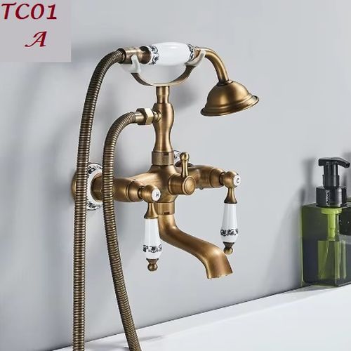 Antikolt réz kádtöltő csaptelep porcelán fogantyúkkal